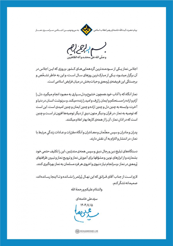 منبع: پايگاه اطلاعرسانی دفتر حفظ و نشر آثار حضرت آيتاللهالعظمی سيدعلی خامنهای (مدظلهالعالی)